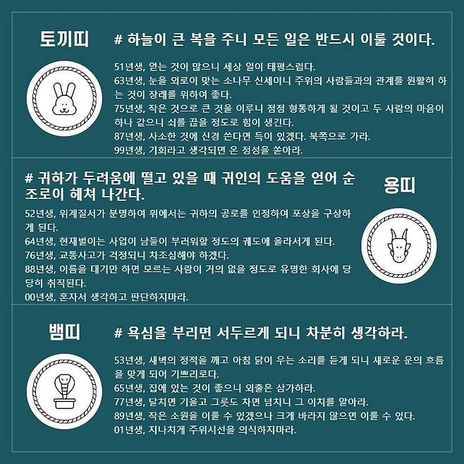 토끼띠 # 하늘이 큰 복을 주니 모든 일은 반드시 이룰 것이다. 51년생, 얻는 것이 많으니 세상 일이 태평스럽다. 63년생, 눈을 외로이 맞는 소나무 신세이니 주위의 사람들과의 관계를 원활히 하는 것이 장래를 위하여 좋다. 75년생, 작은 것으로 큰 것을 이루니 점점 형통하게 될 것이고 두 사람의 마음이 하나 같으니 쇠를 끊을 정도로 힘이 생긴다. 87년생, 사소한 것에 신경 쓴다면 득이 있겠다. 북쪽으로 가라. 99년생, 기회라고 생각되면 온 정성을 쏟아라.