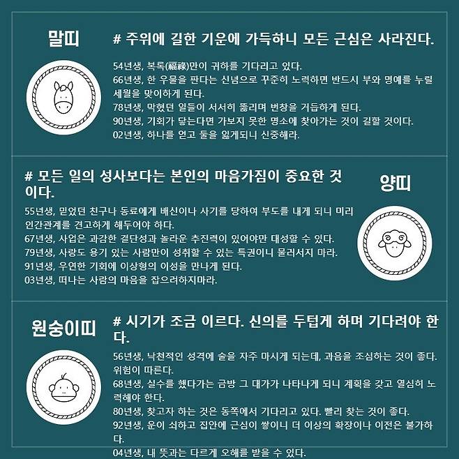 양띠 # 모든 일의 성사보다는 본인의 마음가짐이 중요한 것이다. 55년생, 믿었던 친구나 동료에게 배신이나 사기를 당하여 부도를 내게 되니 미리 인간관계를 견고하게 해두어야 하다. 67년생, 사업은 과감한 결단성과 놀라운 추진력이 있어야만 대성할 수 있다. 79년생, 사랑도 용기 있는 사람만이 성취할 수 있는 특권이니 물러서지 마라. 91년생, 우연한 기회에 이상형의 이성을 만나게 된다. 03년생, 떠나는 사람의 마음을 잡으려하지마라.
