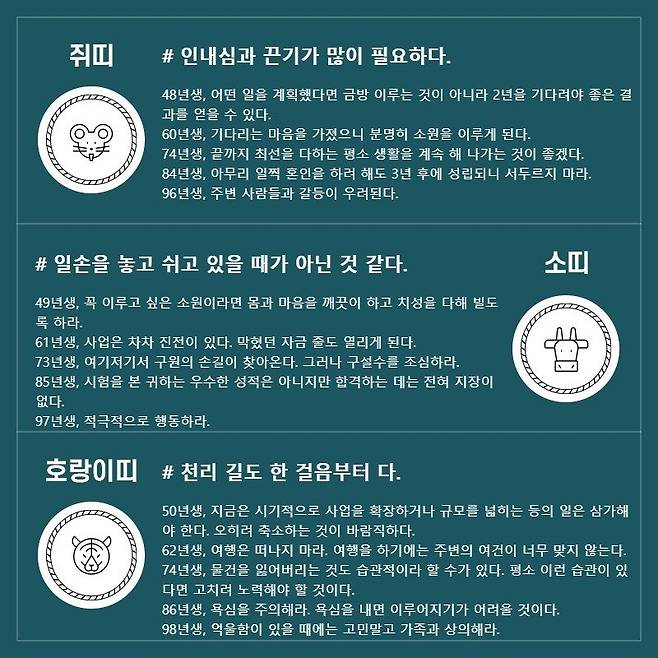 쥐띠 # 인내심과 끈기가 많이 필요하다. 48년생, 어떤 일을 계획했다면 금방 이루는 것이 아니라 2년을 기다려야 좋은 결과를 얻을 수 있다. 60년생, 기다리는 마음을 가졌으니 분명히 소원을 이루게 된다. 74년생, 끝까지 최선을 다하는 평소 생활을 계속 해 나가는 것이 좋겠다. 84년생, 아무리 일찍 혼인을 하려 해도 3년 후에 성립되니 서두르지 마라. 96년생, 주변 사람들과 갈등이 우려된다.