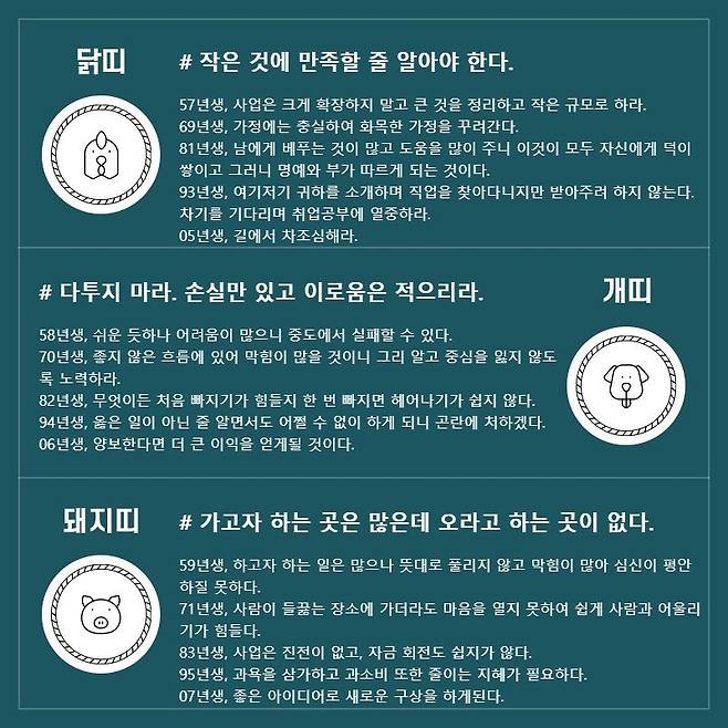 돼지띠 # 가고자 하는 곳은 많은데 오라고 하는 곳이 없다. 59년생, 하고자 하는 일은 많으나 뜻대로 풀리지 않고 막힘이 많아 심신이 평안하질 못하다. 71년생, 사람이 들끓는 장소에 가더라도 마음을 열지 못하여 쉽게 사람과 어울리기가 힘들다. 83년생, 사업은 진전이 없고, 자금 회전도 쉽지가 않다. 95년생, 과욕을 삼가하고 과소비 또한 줄이는 지혜가 필요하다. 07년생, 좋은 아이디어로 새로운 구상을 하게된다.