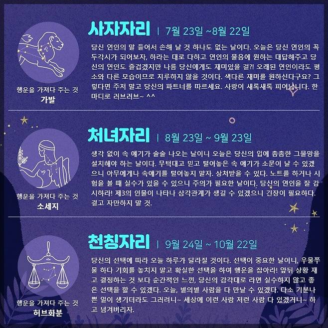 사자자리 (7.23 ~ 8.22) 당신 연인의 말 들어서 손해 날 것 하나도 없는 날이다. 오늘은 당신 연인의 꼭두각시가 되어보자, 하라는 대로 다하고 연인의 물음에 원하는 대답해주고 당신의 연인도 즐겁겠지만 나름 당신에게도 재미있을 걸?! 오래된 연인이라도 평소와 다른 모습이므로 지루하지 않을 것이다. 색다른 재미를 원하신다구요? 그렇다면 주저 말고 당신의 파트너를 따르세요. 사랑이 새록새록 피어납니다. 한 마디로 러브러브~ ^^ 행운을 가져다 주는 것 : 가발