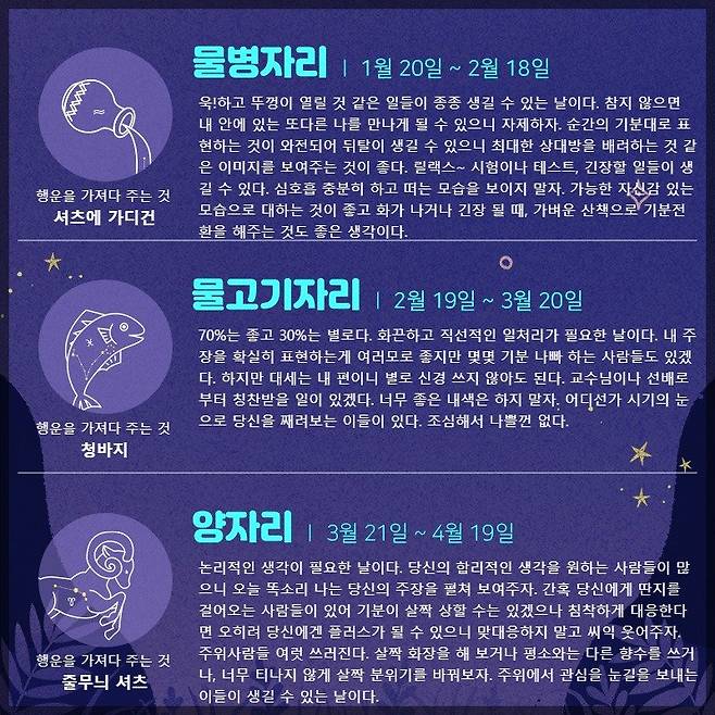 물병자리 (1.20 ~ 2.18) 욱!하고 뚜껑이 열릴 것 같은 일들이 종종 생길 수 있는 날이다. 참지 않으면 내 안에 있는 또다른 나를 만나게 될 수 있으니 자제하자. 순간의 기분대로 표현하는 것이 와전되어 뒤탈이 생길 수 있으니 최대한 상대방을 배려하는 것 같은 이미지를 보여주는 것이 좋다. 릴랙스~ 시험이나 테스트, 긴장할 일들이 생길 수 있다. 심호흡 충분히 하고 떠는 모습을 보이지 말자. 가능한 자신감 있는 모습으로 대하는 것이 좋고 화가 나거나 긴장 될 때, 가벼운 산책으로 기분전환을 해주는 것도 좋은 생각이다. 행운을 가져다 주는 것 : 셔츠에 가디건