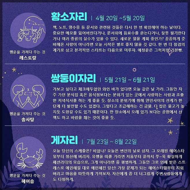 쌍둥이자리 (5.21 ~ 6.21) 가보고 싶다고 체크해두었던 와인 바가 있다면 오늘 같은 날 가라. 그동안 자주 가던 분식집 혹은 음식점보다는 분위기 있는 곳에서 사랑하는 사람과 조촐한 저녁식사를 하는 게 좋을 듯. 장소의 분위기에 취해 연인사이의 관계가 한 단계 더 발전할 수도 있겠다. 그렇다고 조급해하는 건 금물. 다 잡은 물고기 놓치듯 도망갈 수도 있기 때문이다. 한 장소에서 오래 있기 보다는 공원에서 산책도 하고 바람을 쐐는 것이 좋을 듯. 행운을 가져다 주는 것 : 솜사탕