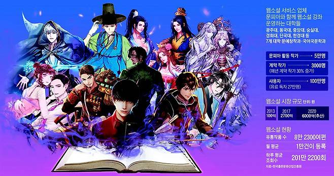 전국 32개 대학이 문예창작과를 운영하고 있다. 장르 문학을 향한 변화 바람은 거세지고 있다. 청강문화산업대학교는 지난 2019년부터 웹소설창작 전공을 만들어 별도 커리큘럼을 운영하고 있다. 광주대를 비롯해 동국대, 단국대 등 7개 대학은 지난해부터 문피아와 함께 웹소설 창작 강좌를 시작했다. 이 대학 문창과·국어국문학과 학생들은 보통 3개월 동안 유명 웹소설 작가에게 이론을 배우고 집필 훈련을 한다. 문피아 관계자는 “웹소설 창작 수업을 열면 보통 10대1 의 경쟁률을 보일 정도로 작가 지망생들의 관심이 높다”며 “한 해 5억원 이상 수익을 올리는 인기 작가는 30명을 넘는다”고 말했다.