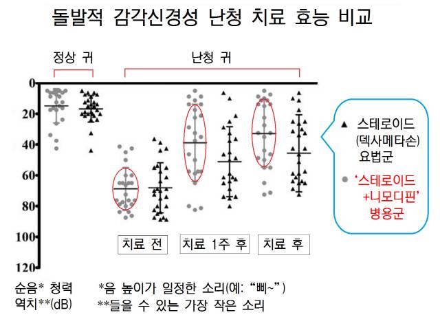 한 교수팀은 돌발적인 감각신경성 난청으로 내원한 성인 78명(평균 50.5세, 19~77세) 중 42명에게 덱사메타손을, 36명에게 덱사메타손+니모디핀 병용투여군으로 나눠 효능을 비교했다. 양쪽 모두 5일 동안 덱사메타손을 하루 10㎎, 병용군은 덱사메타손과 니모디핀을 각각 하루 10㎎씩 투여하고 이후 10일 동안 덱사메타손 투여량을 줄여갔다.
