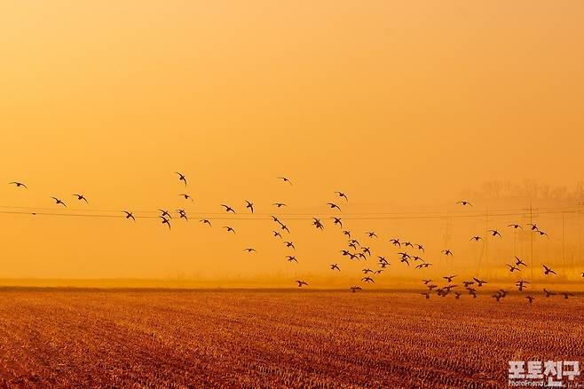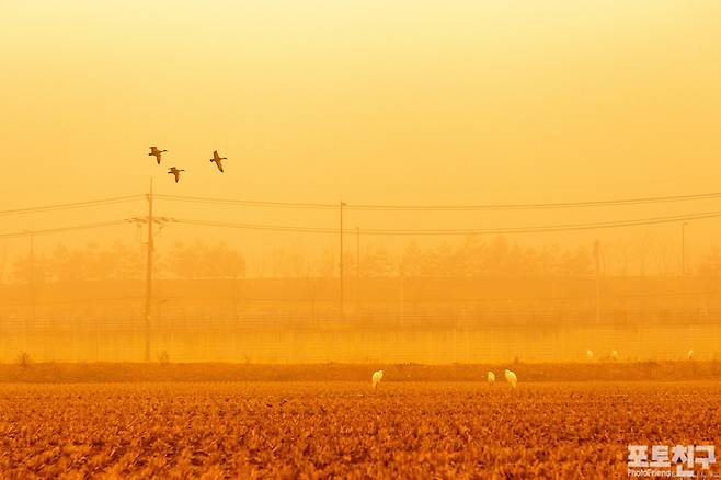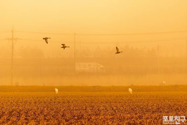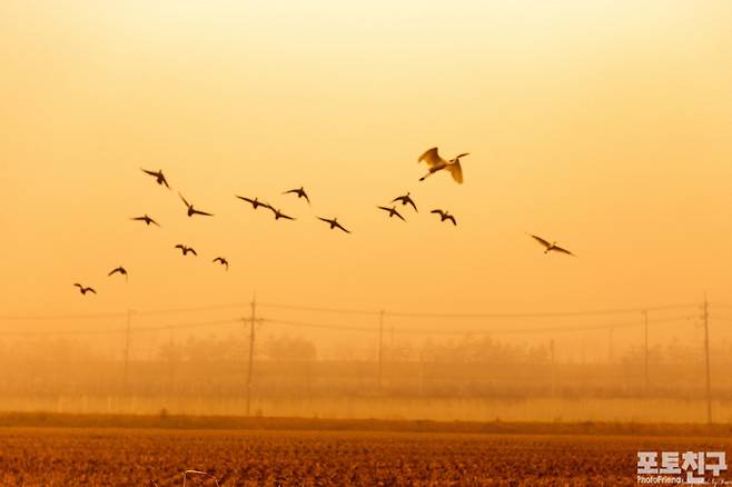 한 치 앞도 보이지 않는 들녘의 아침 안개를 헤치며 먹이를 찾아 논으로 날아드는 새들을 만났다.