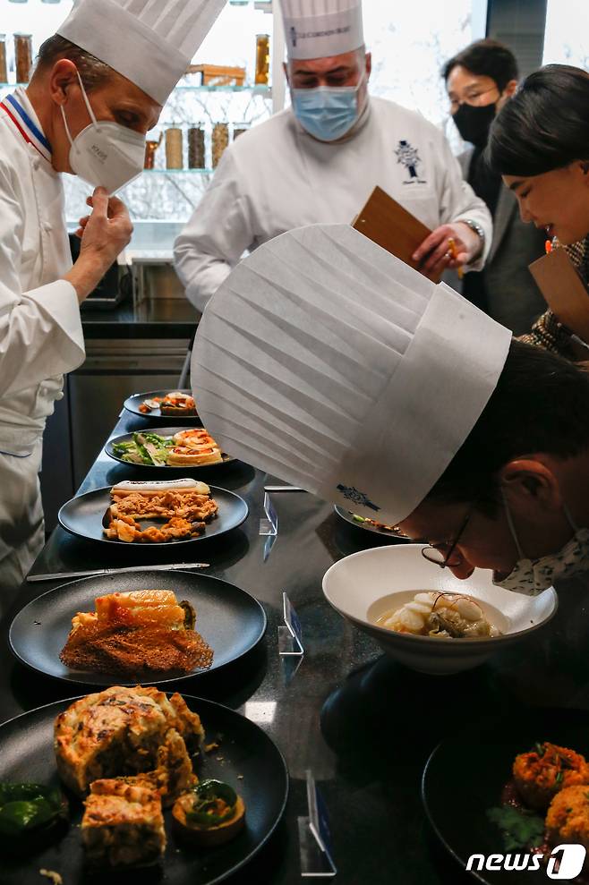 (파리=뉴스1) 이준성 프리랜서기자 = 11일(현지시간) 세계 3대 요리 학교인 프랑스 ‘르 꼬르동 블루(Le Cordon Blue)’ 파리 본교에서 한국의 김치를 응용한 ‘제2회 종가 김치 응용 요리 대회’가 열려 심사 관계자들이 참가자들이 선보인 작품들을 심사하고 있다.