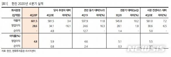 김유혁 한화투자증권 연구원은 "지난해 한진의 4분기 잠정실적은 매출액 6015억원, 영업이익 286억원으로 전년 동기 대비 11.8%, 16.3% 상승해 시장기대치를 하회했다"며 "비용 증가로 택배사업부 실적이 부진했다"고 분석했다.