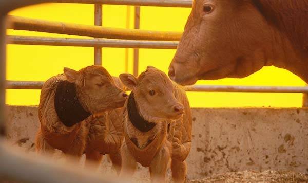 보온등 아래 서로 몸을 기댄 송아지 두 마리, 갈색조끼를 입고 목도리까지 둘렀다. 출산과정이 순탄치 않았을 법한데 다행히 순산했단다.