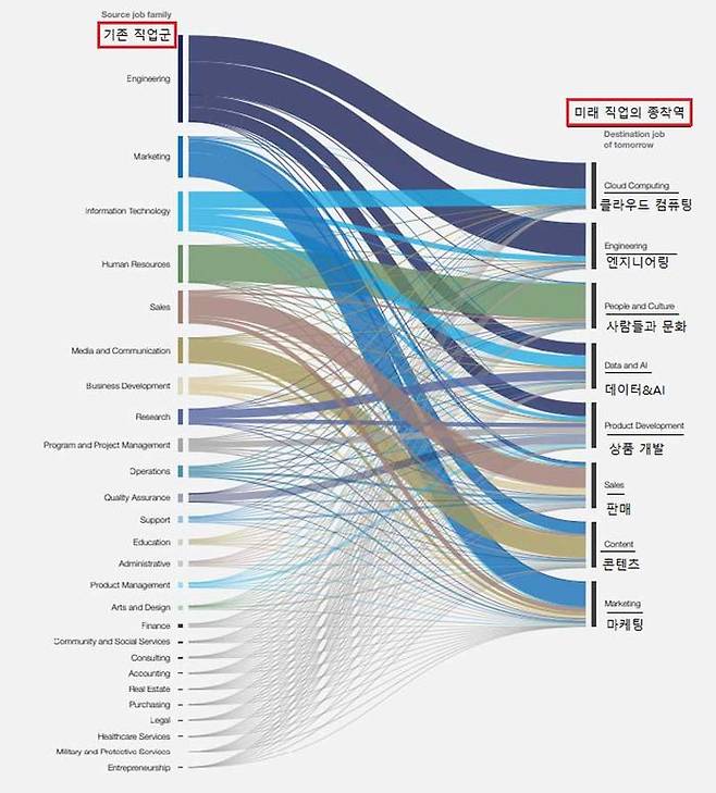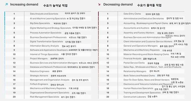 - 인공지능(AI), 콘텐츠 생산, 아동·노인을 대상으로 한 '돌봄 경제' 분야 등도 새 일자리를 공급하게 될 산업 분야가 될 것이라는 전망이다. 반면 자료 입력, 회계, 행정 보조 업무는 줄어드는 추세이다.