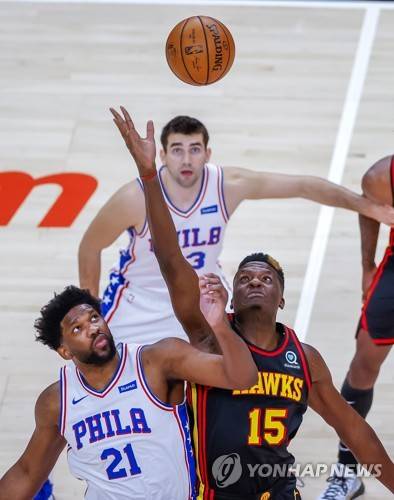epa08932207 Atlanta Hawks center Clint Capela of Switzerland (R) tips off against Philadelphia 76ers center Joel Embiid (L) during the first half of the NBA basketball game between the Philadelphia 76ers and the Atlanta Hawks at State Farm Arena in Atlanta, Georgia, USA, 11 January 2021. EPA/ERIK S. LESSER SHUTTERSTOCK OUT
