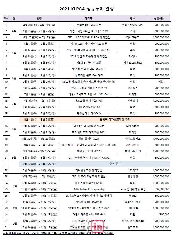 2021년 일정은 지난해 예정된 대회 수와 같지만, 총상금은 280억원으로 크게 늘어 대회당 평균 상금은 사상 처음 9억원대로 커졌다.