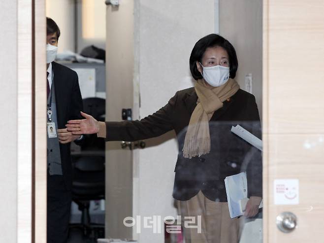 [포토] 브리핑룸 입장하는 박영선 장관