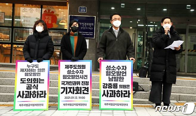(제주=뉴스1) 오미란 기자 = 제주 19개 시민사회단체·정당으로 구성된 제주차별금지법제정연대가 12일 오전 국가인권위원회 제주출장소 앞에서 강충룡 제주도의회 의원(서귀포시 송산동·효돈동·영천동·국민의힘)의 성소수자 혐오 발언에 대한 진정서를 제출하는 내용의 기자회견을 하고 있다.2020.1.12/뉴스1