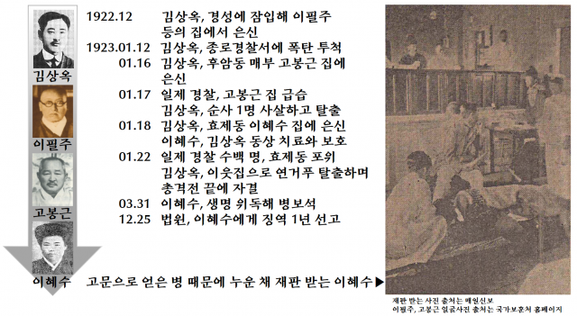 그녀는 28세 이혜수. 이혜수가 이 지경이 된 이유는 그해 1월 12일 종로경찰서에 폭탄을 던진 의열단 김상옥을 숨겨줬기 때문입니다. ‘숨 멎어서도 방아쇠는…항일시가전 호외’(2020년 11월 21일자)에 소개한 대로 김상옥은 매부 고봉근의 후암동 집에 숨어 있었죠. 세입자의 밀고로 일제 경찰이 들이닥치자 그는 체포조인 유도사범 다무라를 사살하고 우메다, 이마세 두 경부에게 총상을 입힌 뒤 탈출했습니다. 김상옥은 맨발로 눈 덮인 남산을 넘어 효제동의 이혜수 집으로 간신히 숨어들었죠. 1월 18일의 일이었습니다.