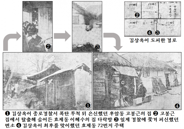 총알이 막내딸을 지나쳐 구리다 경부를 맞힌 순간 김상옥은 다락의 벽을 손으로 뜯어내고 옆집으로 피신했습니다. 효제동 73번지에서 74번지로, 다시 76번지로 벽을 뚫고 들어간 뒤 이 집 변소에 있다가 72번지로 넘어갔죠. 김상옥은 집주인에게 이불을 달라고 했습니다. 이불로 경찰의 총알을 막으며 싸우려던 것이죠. 하지만 중과부적, 결국 그는 자결했습니다.