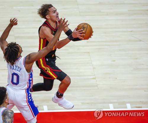 epa08932238 Atlanta Hawks guard Trae Young (R) in action against Philadelphia 76ers guard Tyrese Maxey (L) during the second half of the NBA basketball game between the Philadelphia 76ers and the Atlanta Hawks at State Farm Arena in Atlanta, Georgia, USA, 11 January 2021. EPA/ERIK S. LESSER SHUTTERSTOCK OUT