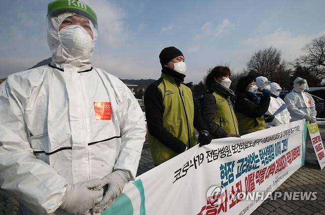 (서울=연합뉴스) 이재희 기자 = 12일 오전 청와대 분수대 앞에서 보건의료노조원들이 '코로나19 전담병원 보건의료노동자 이탈실태 발표 및 대책마련 촉구 기자회견'을 하고 있다. 2021.1.12