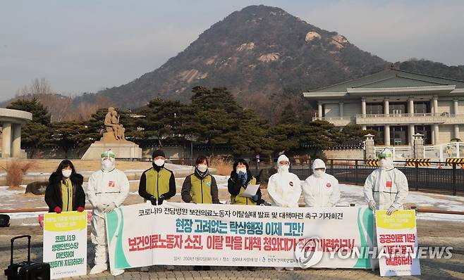 (서울=연합뉴스) 이재희 기자 = 12일 오전 청와대 분수대 앞에서 보건의료노조원들이 '코로나19 전담병원 보건의료노동자 이탈실태 발표 및 대책마련 촉구 기자회견'을 하고 있다. 2021.1.12