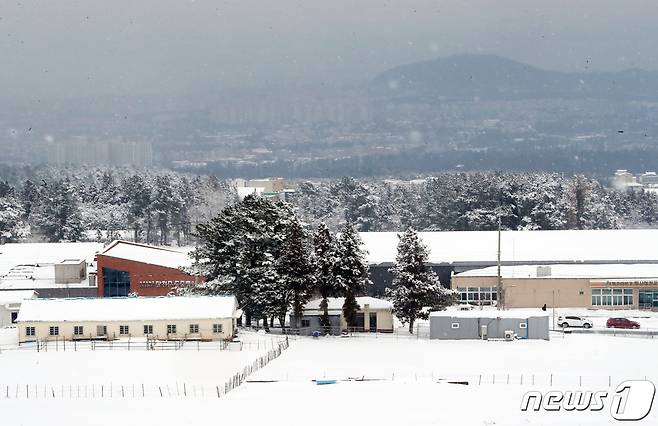 (제주=뉴스1) 오현지 기자 = 제주도 전역에 대설주의보가 발효된 12일 오전 제주시 오라동 인근 도로에서 바라본 제주시내에 눈이 가득 쌓여 있다.2021.1.12/뉴스1