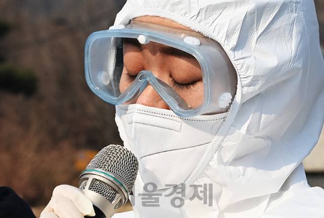 [서울경제] 전국보건의료산업노동조합 소속 코로나19 전담병원 간호사가 12일 오전 청와대 분수대 앞에서 기자회견을 열고 전담병원의 보건의료 인력 소진과 이탈을 호소하며 정원 일시 확대 및 전담병원 지정·운영에 따른 소실 보상 현실화 등 정부의 대책 마련을 촉구하던 중 눈물을 흘리고 있다./오승현기자 2021.01.12
