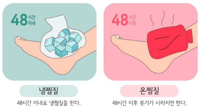 출혈·부종이 없거나 호전된 뒤에는 온찜질을 하는 게 혈액순환을 좋게 해 손상된 조직의 회복을 돕는다. 연세건우병원 최홍준 족부전문의는 “염좌의 정도가 심해 깁스를 하면 관절이 강직될 수 있으므로 온찜질을 하면 근육 긴장이 완화되고 신진대사가 원활해질 수 있다. 또 인대 쪽 출혈이 생겼을 때 온찜질을 하면 고여 있던 피가 빠르게 흡수되고 통증이 줄어들기도 한다”고 조언했다.