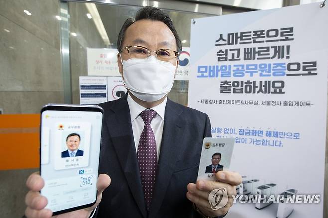 (서울=연합뉴스) 12일 황서종 인사혁신처장이 세종시 인사혁신처 청사 보안 출입문 앞에서 모바일공무원증을 시연하고 있다. 2021.1.12