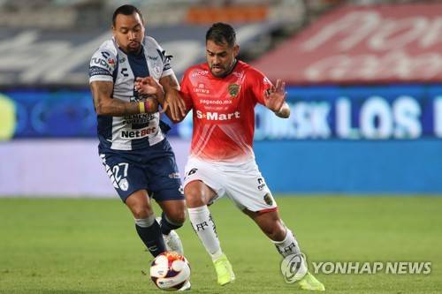 epa08932258 Edgar Pardo (L) of Pachuca in action against Jose Esquivel (R) of FC Juarez during the Liga MX Clausura Tournament soccer match between Pachuca and FC Juarez, at the Hidalgo Stadium in Pachuca, Mexico, 11 January 2021. EPA/David Martinez Pelcastre