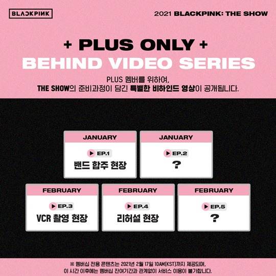 12일 블랙핑크 공식 SNS에는 ‘BLACKPINK: THE SHOW’ 채널 멤버십 관련 공지가 게재됐다. 여기에는 그동안 팬들이 궁금해했던 PLUS 멤버십 가입자들을 위한 비하인드 콘텐츠 내용이 안내됐다.
