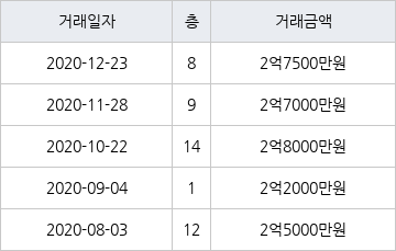 [이 기사는 조선비즈와 아티웰스가 공동으로 개발해 서비스하는 로봇 기사입니다.]국토교통부 실거래가 공개시스템에 따르면 지난 2020년 12월 23일 경기도 수원시 장안구 정자동 정자동신2차 8층 전용면적 69㎡형이 2억7500만원에 거래됐다.