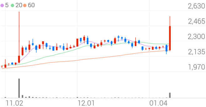 전일 대비 20.32% 상승한 2,635원에 거래되고 있다.