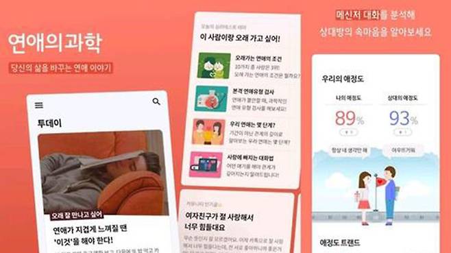 연애의 과학은 연인과 나눈 카톡 대화를 집어넣으면 답장 시간 등의 대화 패턴을 분석해 애정도 수치를 보여주는 앱입니다.