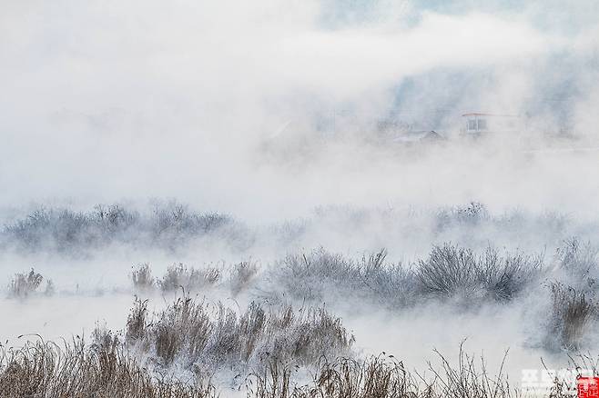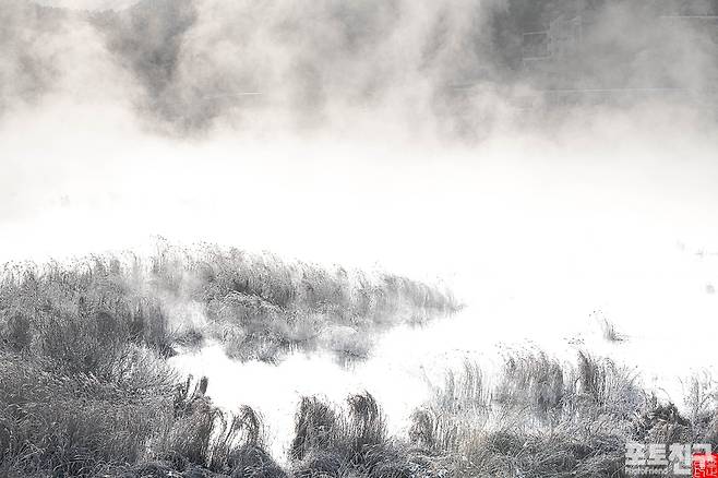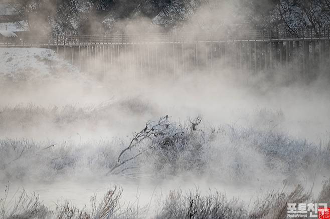 영하 21도의 춘천 소양강이 펄펄 끓고 있습니다.
