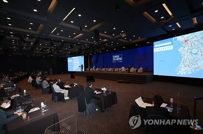 (서울=연합뉴스) 류효림 기자 = 12일 오후 서울 여의도 중소기업중앙회에서 열린 '참 괜찮은 일자리 플랫폼' 론칭 행사에서 한 관계자가 일자리 플랫폼 서비스를 소개하고 있다. 2021.1.12