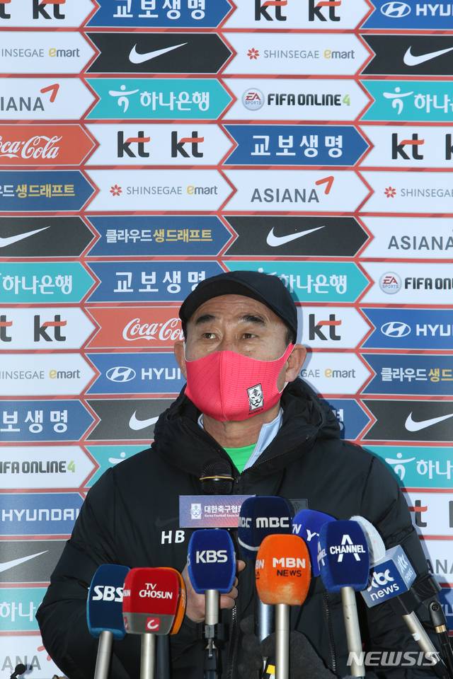[강릉=뉴시스] 김유나 기자 = 김학범 축구 올림픽대표팀 감독이 12일 오후 강원 강릉시 강릉종합운동장에서 도쿄올림픽 출전을 앞두고 열린 1차 국내 훈련에서 기자들의 질문에 답변하고 있다. 2021.01.12. kuna624@newsis.com