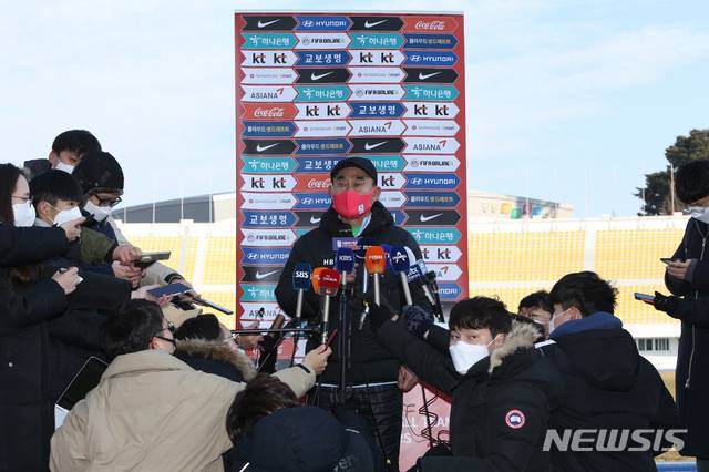 [강릉=뉴시스] 김유나 기자 = 김학범 축구 올림픽대표팀 감독이 12일 오후 강원 강릉시 강릉종합운동장에서 도쿄올림픽 출전을 앞두고 열린 1차 국내 훈련에서 기자들의 질문에 답변하고 있다. 2021.01.12. kuna624@newsis.com