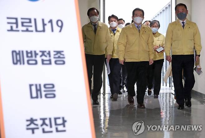 (청주=연합뉴스) 김주형 기자 = 정세균 국무총리가 신종 코로나바이러스 감염증(코로나19) 예방접종 준비상황을 점검하기 위해 12일 오후 청주시 흥덕구 국립의과학지식센터에 마련된 코로나19 예방접종 대응 추진단 사무실로 이동하고 있다. 2021.1.12