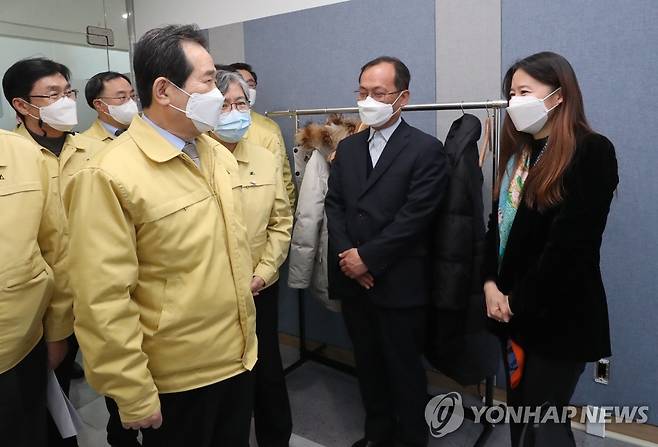 (청주=연합뉴스) 김주형 기자 = 정세균 국무총리가 신종 코로나바이러스 감염증(코로나19) 예방접종 준비상황을 점검하기 위해 12일 오후 청주시 흥덕구 국립의과학지식센터에 마련된 코로나19 예방접종 대응 추진단을 방문해 관계자들을 격려하고 있다. 2021.1.12