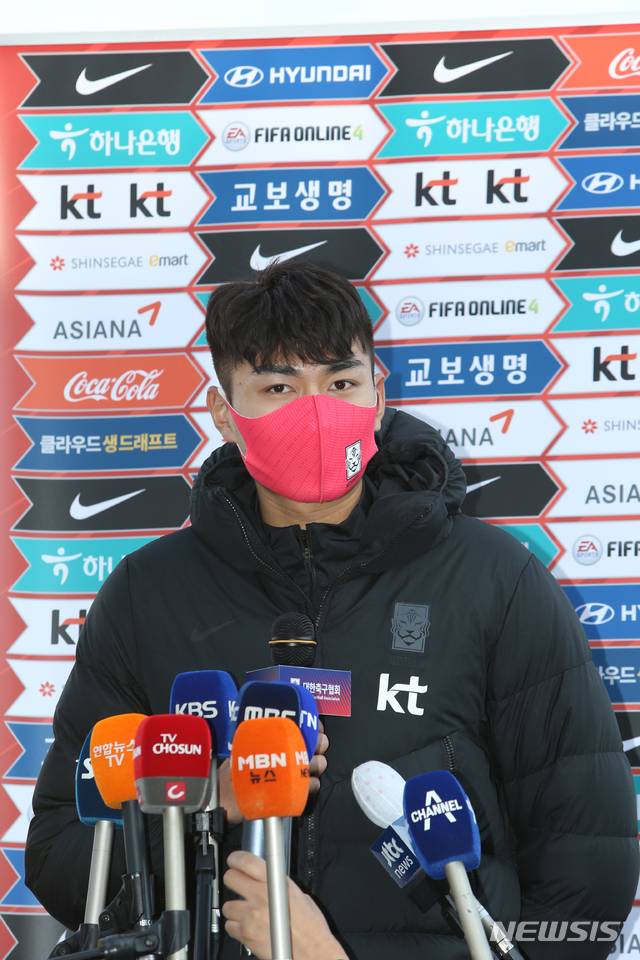 [강릉=뉴시스] 김유나 기자 = 정태욱 축구 올림픽대표팀 주장이 12일 오후 강원 강릉시 강릉종합운동장에서 도쿄올림픽 출전을 앞두고 열린 1차 국내 훈련에서 기자들의 질문에 답변하고 있다. 2021.01.12. kuna624@newsis.com