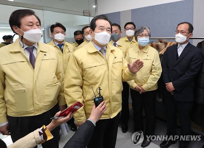 (청주=연합뉴스) 김주형 기자 = 정세균 국무총리가 신종 코로나바이러스 감염증(코로나19) 예방접종 준비상황을 점검하기 위해 12일 오후 청주시 흥덕구 국립의과학지식센터에 마련된 코로나19 예방접종 대응 추진단을 방문해 관계자들을 격려하고 있다. 2021.1.12