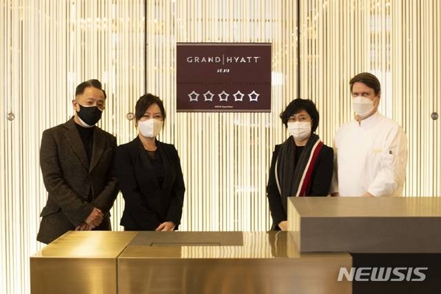 [제주=뉴시스]강경태 기자 = 롯데관광개발이 12일 오전 제주 드림타워 복합리조트 내 그랜드하얏트에서 호텔 5성급 현판식을 진행하고 있다. 이날 현판식에는 폴콱 총지배인(왼쪽부터), 엘리샤 진 리조트서비스 이사, 김진희 인사 총괄 상무, 올리버 웨버 총 주방장 등이 참석했다. (사진=롯데관광개발 제공) 2021.01.12. photo@newsis.com