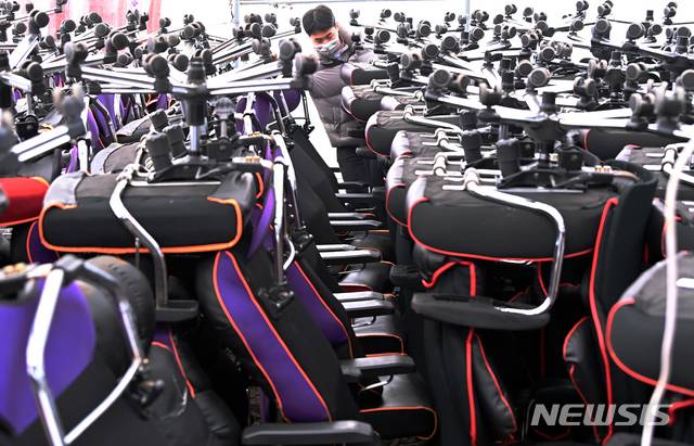 [안산=뉴시스] 김종택기자 = 신종 코로나바이러스 감염증(코로나19) 장기화로 폐업하는 자영업자들이 늘어나고 있는 12일 오후 경기도 안산의 한 중고 컴퓨터 매입 및 판매업체 창고에 PC방 게이밍 의자가 가득 쌓여 있다. 2021.01.12.
