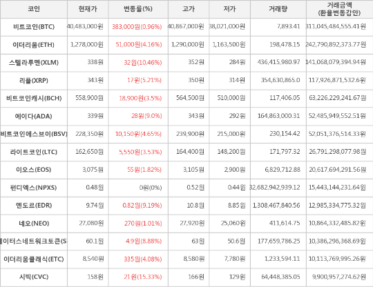 현재 암호화폐 거래소 "업비트"에 따르면 가상화폐 대장 격인 비트코인의 시세는 전일 대비 383,000원(0.96%) 상승한 40,483,000원에 거래되고 있다.