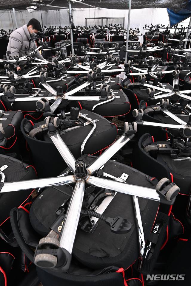 [안산=뉴시스] 김종택기자 = 신종 코로나바이러스 감염증(코로나19) 장기화로 폐업하는 자영업자들이 늘어나고 있는 12일 오후 경기도 안산의 한 중고 컴퓨터 매입 및 판매업체 창고에 PC방 게이밍 의자가 가득 쌓여 있다. 2021.01.12.