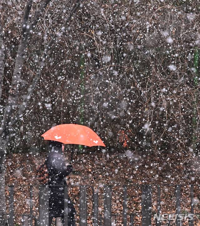 [안산=뉴시스] 김종택기자 = 한파가 주춤해진 12일 오후 경기도 안산시 단원구 거리에서 한 시민이 함박눈을 맞으며 걷고 있다. 2021.01.12.