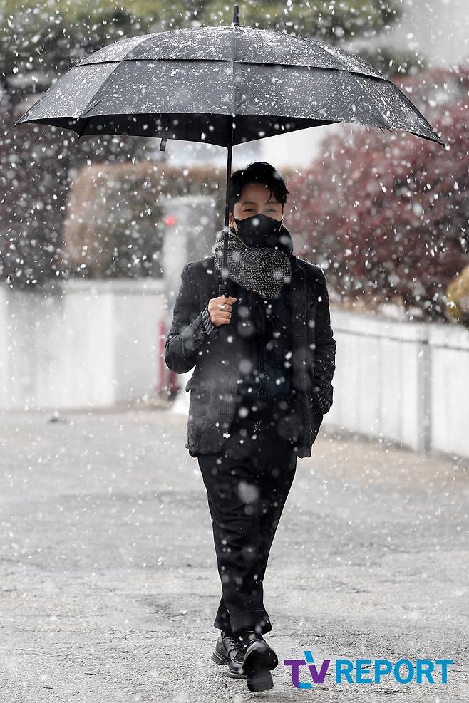 [T포토] 정엽 '함박눈 맞으며 등장'