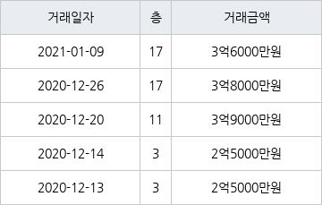 [이 기사는 조선비즈와 아티웰스가 공동으로 개발해 서비스하는 로봇 기사입니다.]국토교통부 실거래가 공개시스템에 따르면 지난 2021년 1월 9일 인천광역시 서구 당하동 원당풍림아이원아파트 17층 전용면적 84㎡형이 3억6000만원에 거래됐다.