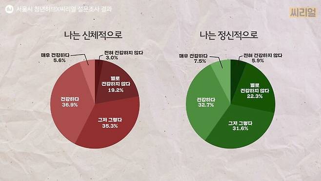 지난해 11월 서울시 청년허브와 씨리얼이 공동으로 진행한 청년 건강권 설문조사에서 '신체적으로 건강하다'고 답한 청년은 42.5%, '정신적으로 건강하다'고 답한 청년은 40.2%로 절반이 채 되지 않았습니다.