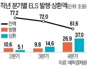 10일 한국예탁결제원에 따르면 지난해 12월 말 기준 ELS 발행잔액은 61조6000억원으로 같은 해 9월 말(72조원) 대비 10조4000억원(14.4%) 감소했다.