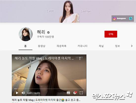그룹 걸스데이(Girl's day) 멤버 겸 배우 혜리가 유튜브 개인 채널 구독자 수 100만 명을 모았다.